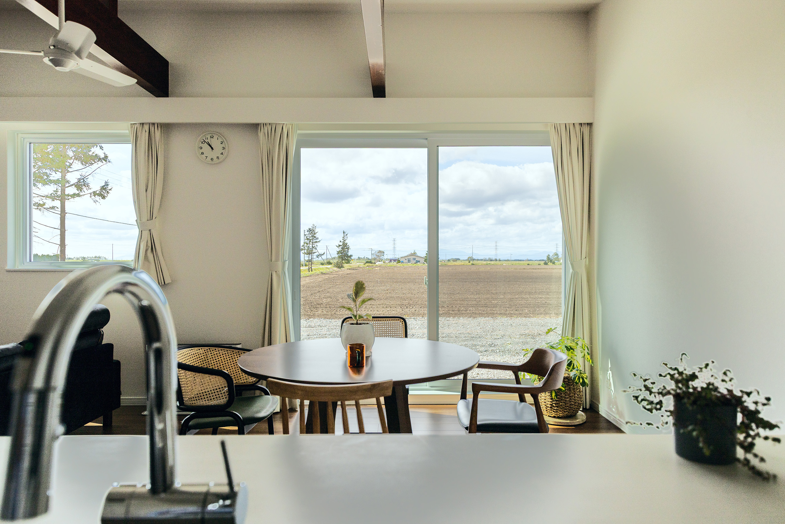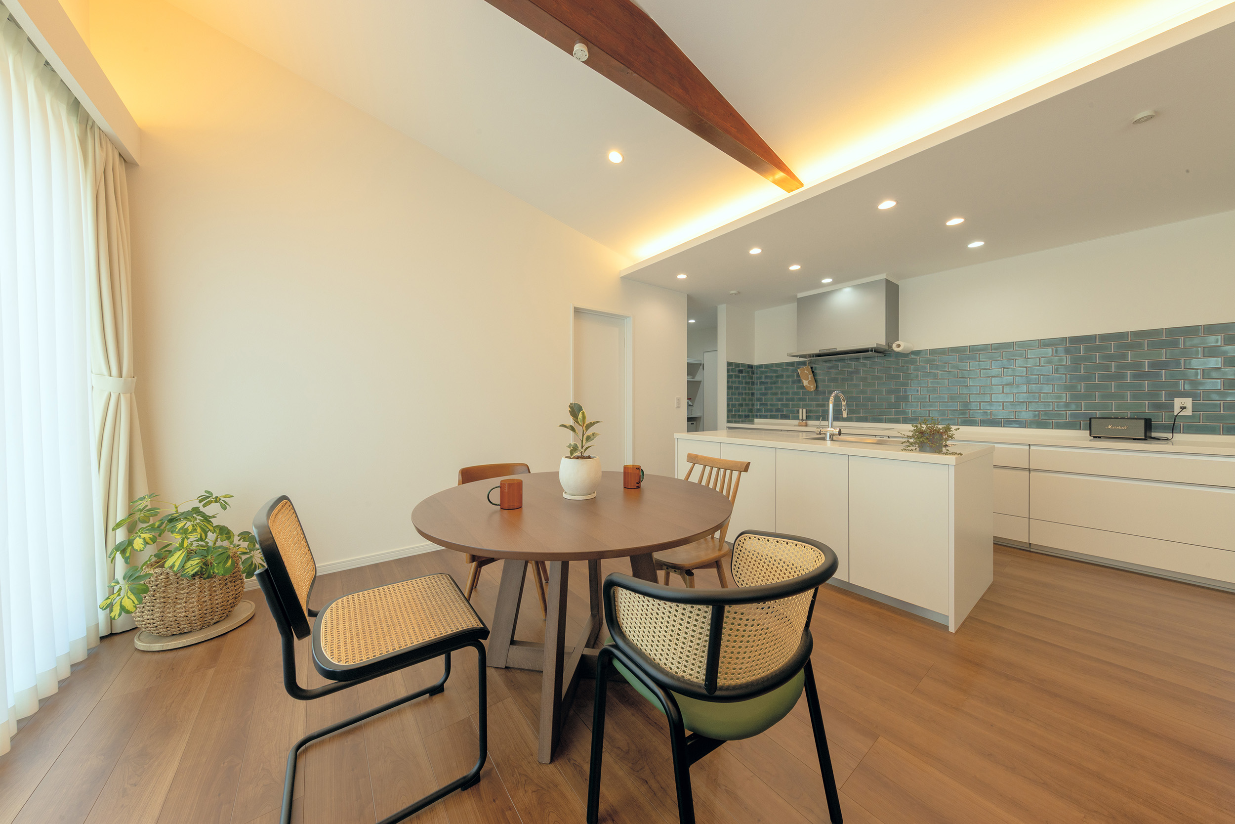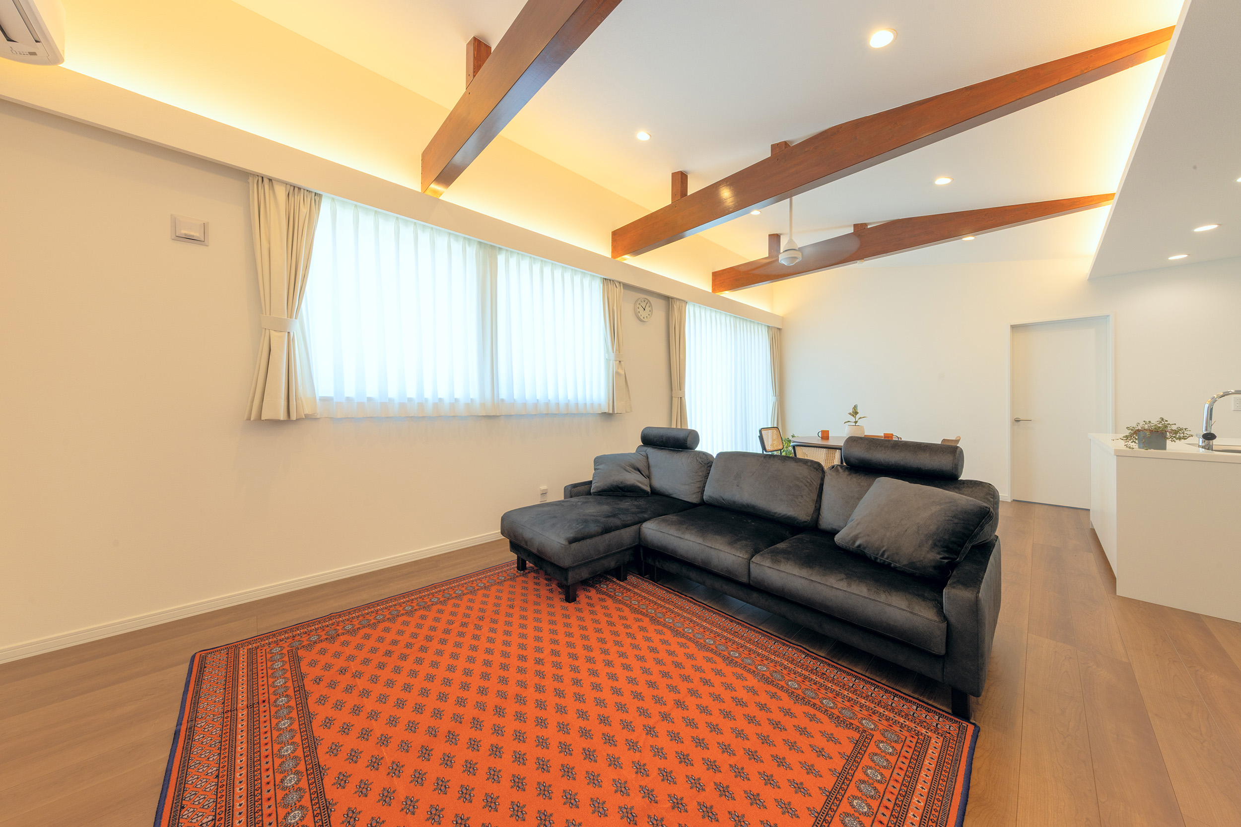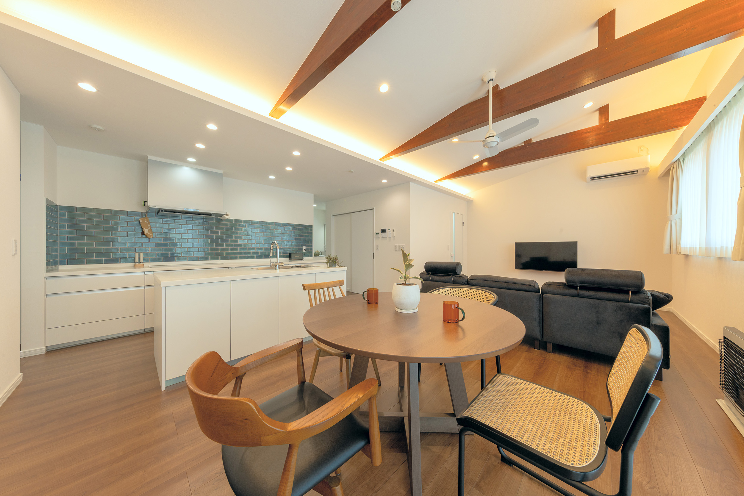 木の温もりを感じる印象的な梁あらわし天井。二型のアイランドキッチンを中心にリビングダイニングで家族がくつろげる設計。